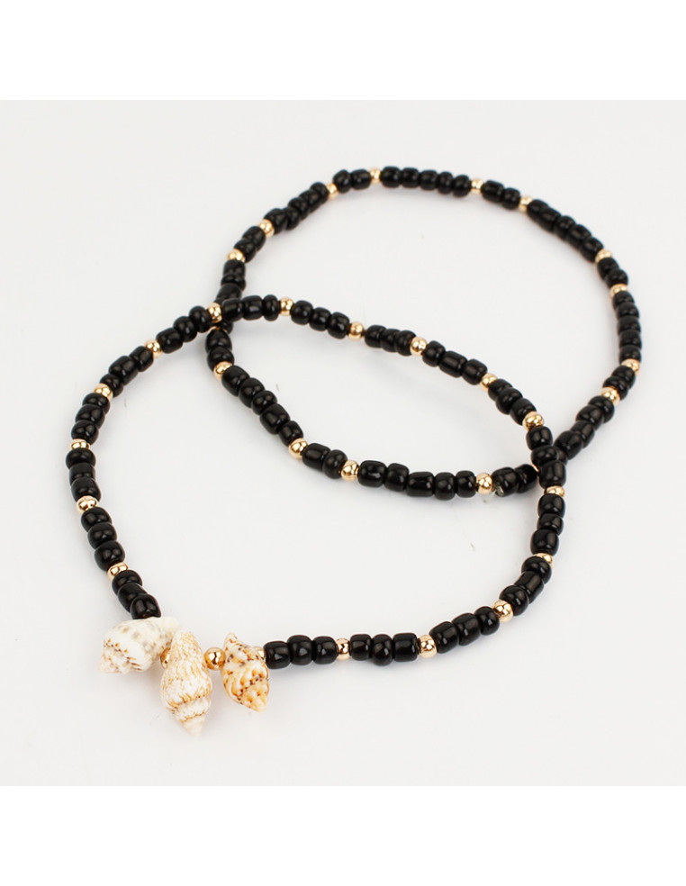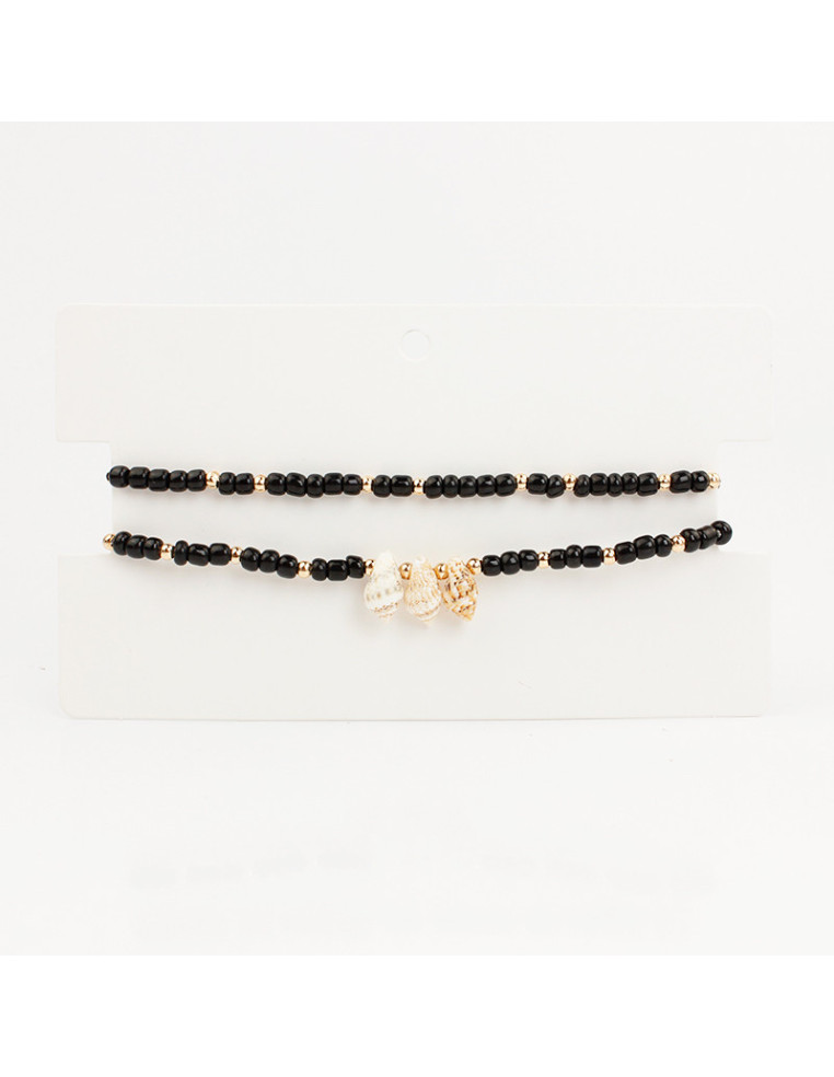 Set de dos tobilleras elásticas, de mostacillas diferenciadas, combinadas con bolitas se paradoras de CCB y caracoles naturales.
