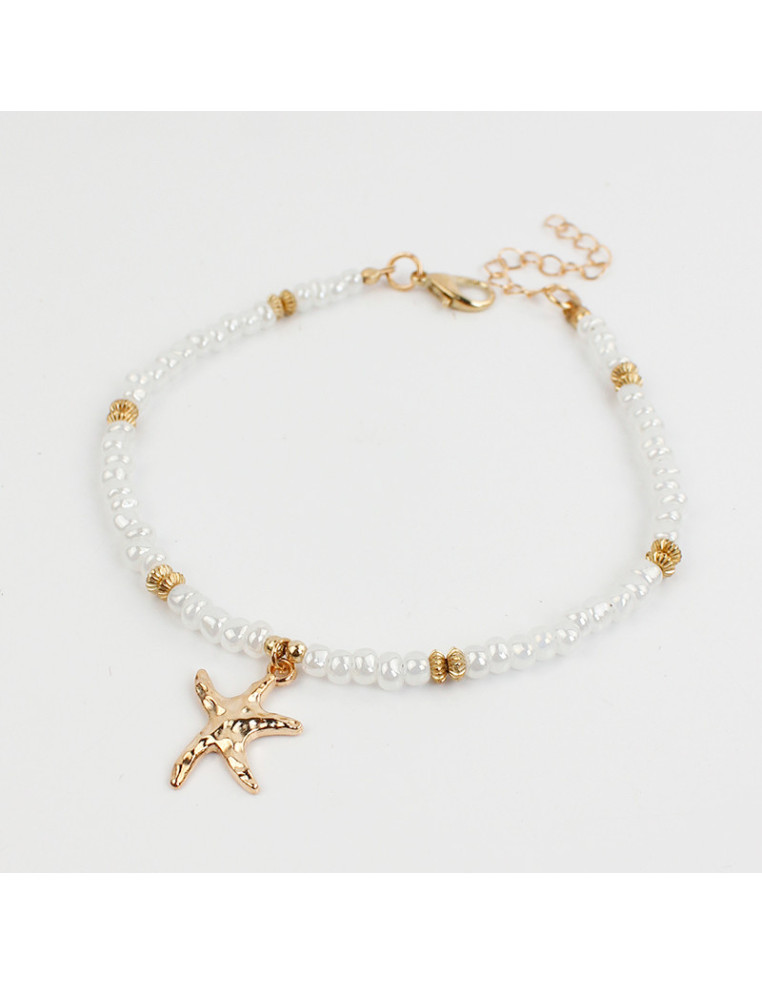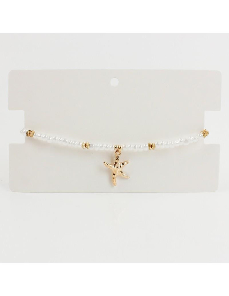 Tobillera de lenga enhebrada con mostacillas perladas, combindas con piezas pasantes de CCB y dije exclusivo de fundición con forma de estrella de mar.