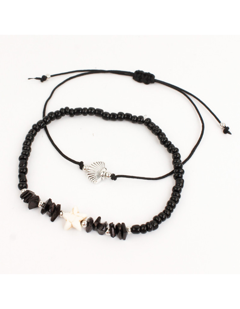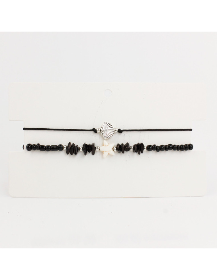 Set de dos tobilleras, una elástica enhebrada con mostacillas, escallas de acrílico y dije de roca reconstituida con forma de estrella, la otra de hilo con dije de fundición marino y cierre con nudo macramé.