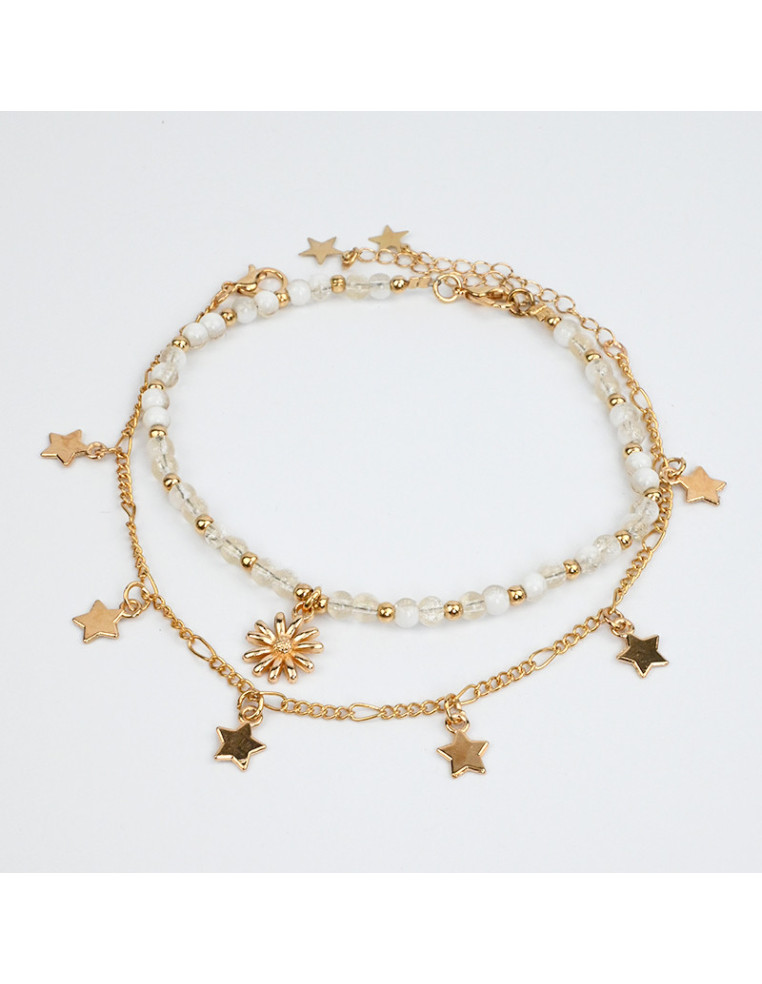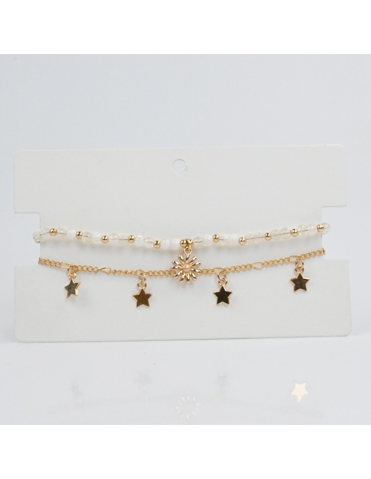 Set de dos tobilleras, una de cadena diferenciada con dijes exclusivos, otra de lenga enhebrada con bolitas de vidrio exclusivas, separadores de CCB  y dije con forma de margarita.