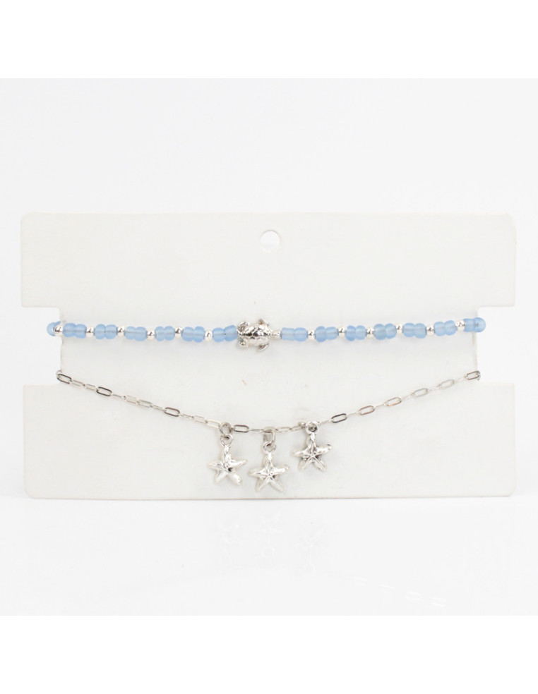 Set de dos tobilleras una de cadena diferenciada con dijes de fundición y otra de lenga enhebrada con cuentas de vidrio exclusivas combinadas con dijes de fundición marinos y separadores de CCB.