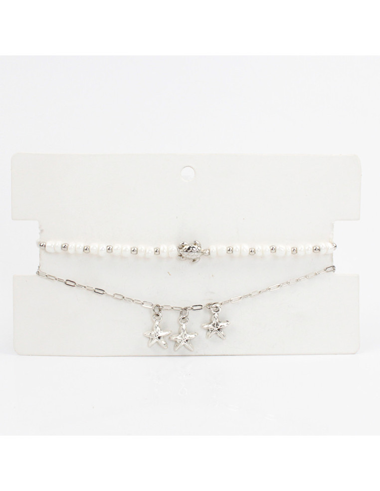 Set de dos tobilleras una de cadena diferenciada con dijes de fundición y otra de lenga enhebrada con cuentas de vidrio exclusivas combinadas con dijes de fundición marinos y separadores de CCB.