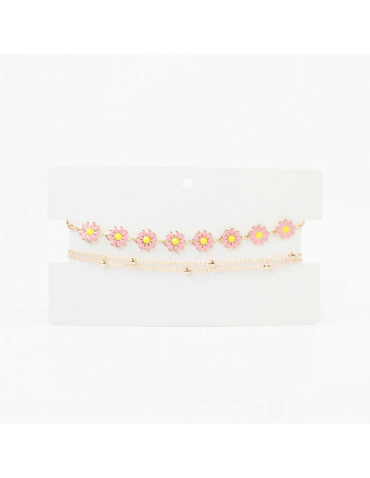Tobillera de cadenas diferenciadas, una de eslabones con forma de flor pintados a mano, otra de cadena de doble caída.
